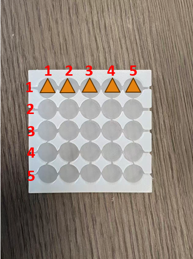 The size of an air chamber is 9 mm of diameter and 0.5 mm of thickness. The choice of chamber diameter aligns with the plantar mechanoreceptor receptive-field sizes reported in FeetThrough (Ushiyama & Lopes, 2023). The electrode diameter of 8 mm in FeetThrough was chosen to match the receptive-field size of plantar mechanoreceptors (SA I and FA I) on the sole. Larger diameters distribute current or pressure more evenly and prevent local pain or overstimulation, a known risk with smaller electrodes. Applying this reasoning to pneumatic chambers, a ≈ 9 mm chamber diameter similarly balances stimulus localization and comfort—large enough to evoke distinct tactile cues at the arch without sharp pressure points, yet small enough to reach discrimination thresholds near the 7–8 mm range reported by Solomonow et al. (1977). This size optimizes the trade-off between spatial resolution and user comfort for effective foot haptic feedback.